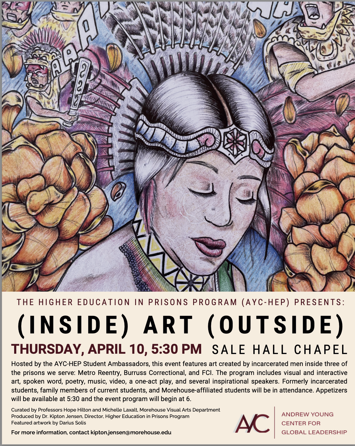Hosted by the AYC-HEP Student Ambassadors, this event features art created by incarcerated men inside three of the prisons we serve: Metro Reentry, Burruss Correctional, and FCI. The program includes visual and interactive art, spoken word, poetry, music, video, a one-act play, and several inspirational speakers. Formerly incarcerated students, family members of current students, and Morehouse-affiliated students will be in attendance.