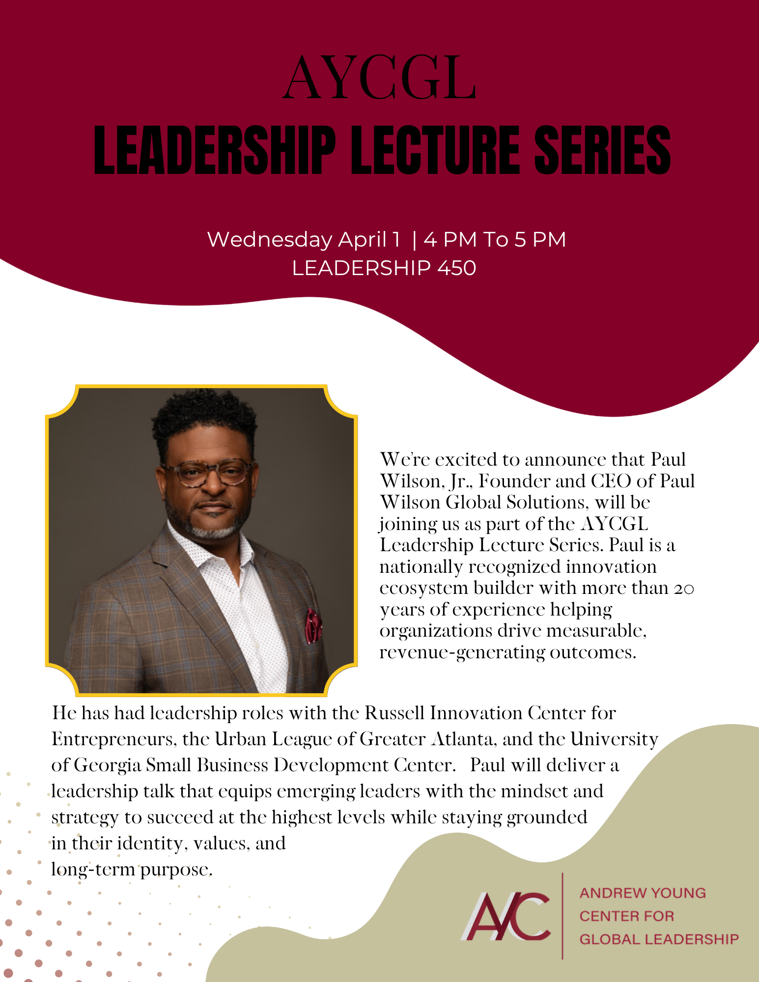 We’re excited to announce that Paul Wilson, Jr. will be joining us as part of the AYCGL Leadership Lecture Series. Paul is a nationally recognized innovation ecosystem builder with more than 20 years of experience helping organizations drive measurable, revenue-generating outcomes. He has had leadership roles with the Russell Innovation Center for Entrepreneurs, the Urban League of Greater Atlanta, and the University of Georgia Small Business Development Center. Paul will deliver a leadership talk that equips emerging leaders with the mindset and strategy to succeed at the highest levels while staying grounded in their identity, values, and long-term purpose.