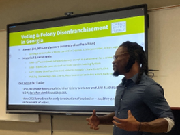 Although several AYC-HEP faculty affiliates and AYC-HEP student ambassadors were in attendance, the primary beneficiaries of this event were formerly incarcerated alumni of CGA; Morehouse faculty teach humanities classes with CGA at several prisons in GA (viz., Metro Reentry Prison, Burruss Correctional, and the Federal Correctional Institution in Atlanta). The session on “Advancing Access” was led by Dominique Harris, who is both an alumnus of CGA and an Outreach Associate for GJP, and Ann Colloton, who is the Policy and Outreach Coordinator at the GJP. The historical and racial context of disenfranchisement, especially for those caught up in the carceral system, claimed Mr. Harris, is very important. It is a fact that Black people are disproportionately over-represented in the incarcerated population: whereas Black men and women comprise only 31% of GA residents, they represent 59% of the prison population. Black people are similarly impacted when it comes probation rates: i.e., twice as likely. Mr. Harris cited the 13th Amendment of 1865 that outlawed slavery except as punishment for a crime, the Black Code Laws that were enacted to create a Convict Leasing System, the 1877 Felony Disenfranchisement Amendment to Georgia’s State Constitution, and the contemporary phenomena of over-policing, sentencing laws, and mass incarceration.